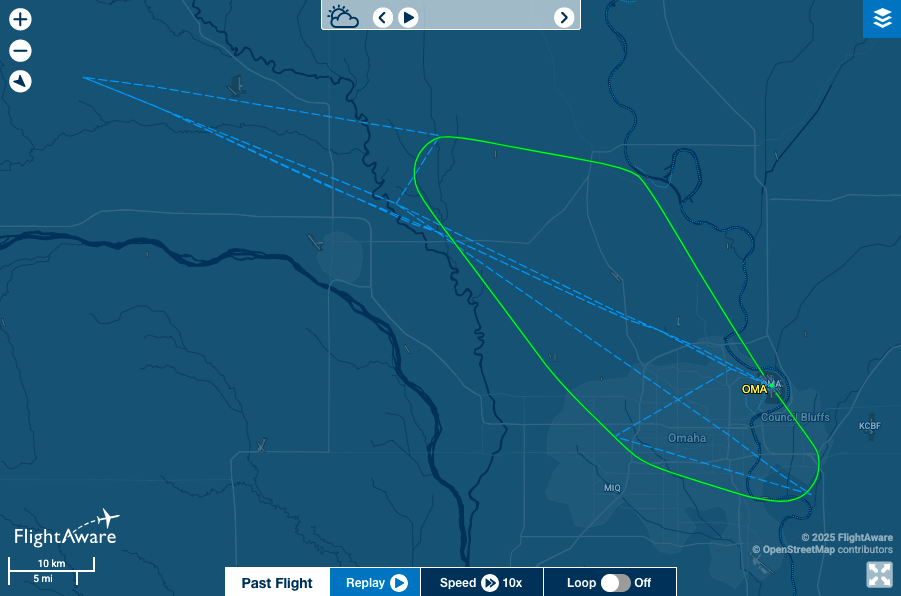 Flight 6469 departed Omaha’s Eppley Airfield at 6:41 p.m. local time bound for Los Angeles but turned back just minutes into the flight. The Embraer ERJ-175 regional jet landed safely only 18 minutes later, according to data from FlightAware: https://www.flightaware.com/live/flight/AAL6469/history/20251020/2343Z/KOMA/KLAX.